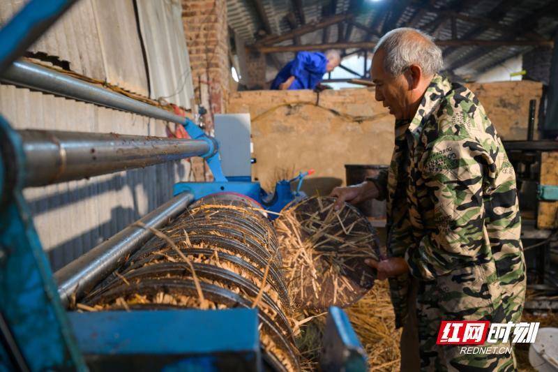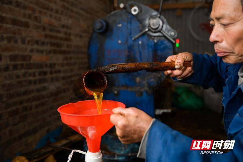 12月12日,资兴市州门司镇杨公塘村榨油坊,村民在观察出油情况。