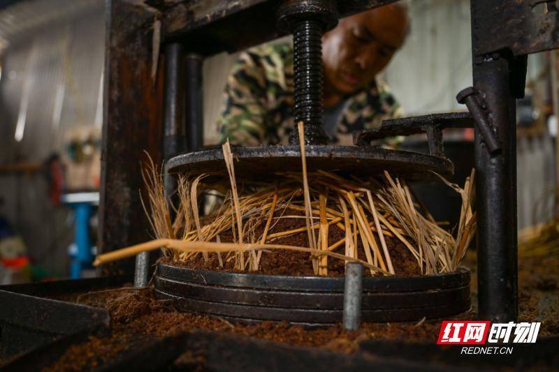 12月12日,资兴市州门司镇杨公塘村榨油坊,村民在压制茶饼。