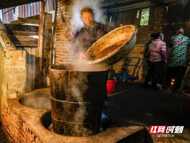 12月12日保宇配资,资兴市州门司镇杨公塘村榨油坊,村民在蒸制茶籽粉。